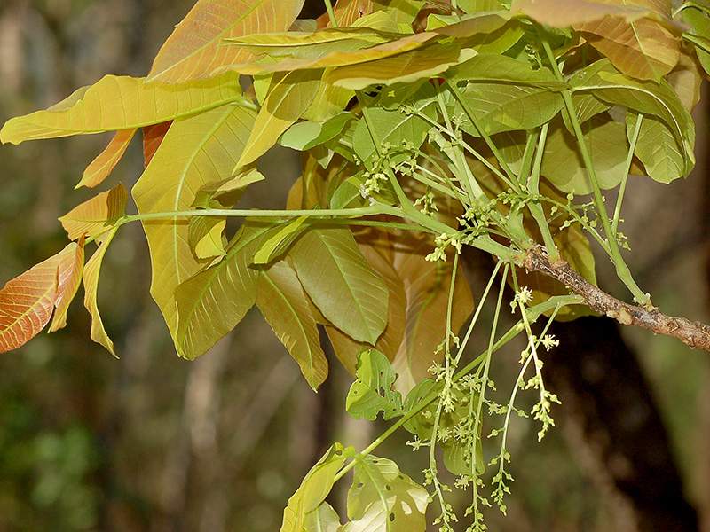 ไม้ต้น ปลายยอดเป็นติ่งคล้ายหูใบ ใบประกอบปลายคู่ มีใบย่อย 2–4 คู่ โคนใบเบี้ยว ใบอ่อนสีน้ำตาลแดงหรืออมม่วง ช่อดอกคล้ายช่อกระจุกไม่แยกแขนง ยาว 6–15 ซม. ดอกมีเพศเดียว กลีบเลี้ยง 4–6 กลีบ ไม่มีกลีบดอก จานฐานดอกรูปวงแหวน ช่อดอกเพศผู้แตกแขนง เกสรเพศผู้ 5–9 อัน ลดรูปในดอกเพศเมีย ช่อดอกเพศเมียส่วนมากไม่แตกแขนง รังไข่มีขนยาว ผลรูปรีเกือบกลม ยาว 1.5–2.5 ซม. ปลายมีติ่งแหลม มี 1–2 เมล็ด กลม เส้นผ่านศูนย์กลางประมาณ 1 ซม. มีเยื่อหุ้มสดสีเหลืองอมน้ำตาล
