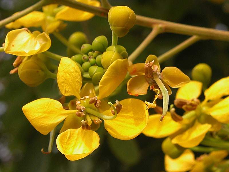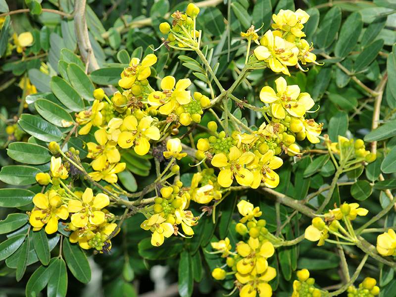 ไม้ต้น ใบประกอบมีใบย่อย 7–15 คู่ ปลายกลมหรือเว้าตื้น มีติ่งแหลม แผ่นใบด้านล่างมีขนสั้นนุ่ม ช่อดอกออกที่ปลายกิ่ง ยาวได้ถึง 1 ม. กลีบเลี้ยงและกลีบดอกจำนวนอย่างละ 5 กลีบ ดอกสีเหลือง กลีบดอกรูปเกือบกลม ยาว 1.5–2 ซม. มีก้านกลีบ เกสรเพศผู้อันยาว 2 อัน อันสั้น 5 อัน ลดรูป 3 อัน รังไข่มีขนสั้นนุ่ม ฝักรูปแถบ แบน ยาว 20–30 ซม. รอยเชื่อมเป็นสันนูน มี 20–30 เมล็ด
