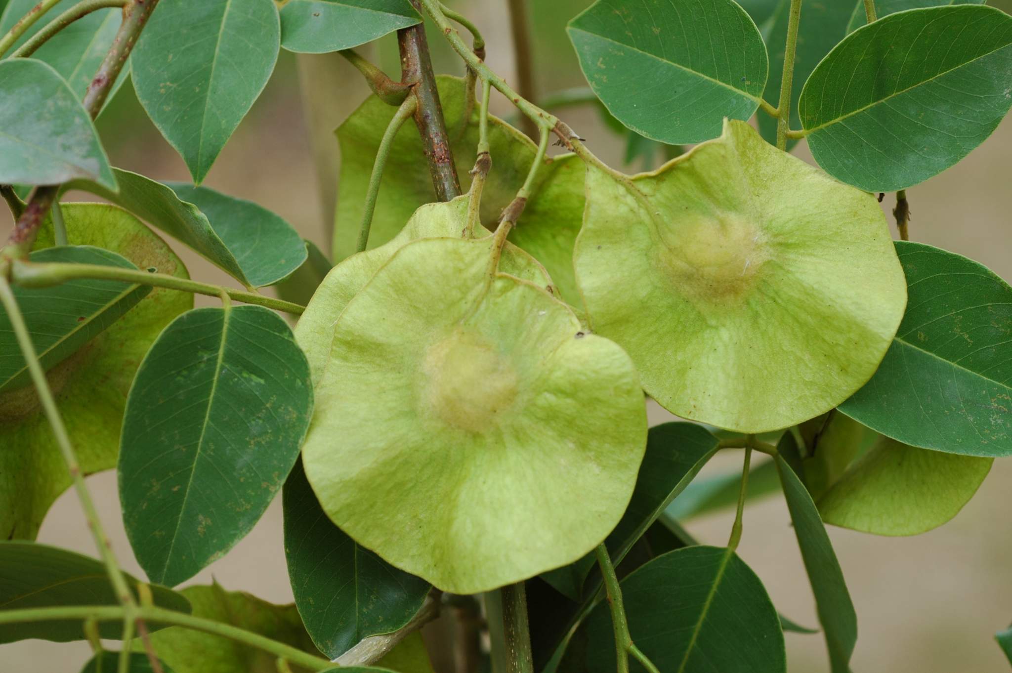 ไม้ต้น สูงได้ถึง 35 ม. มีขนสั้นนุ่มตามกิ่งและใบอ่อน ช่อดอก ก้านดอก กลีบเลี้ยง และรังไข่ หูใบขนาดเล็ก ร่วงเร็ว ใบประกอบเรียงเวียน ยาว 8–25 ซม. ใบย่อยมี 5–13 ใบ เรียงสลับระนาบเดียว รูปขอบขนานหรือแกมรูปไข่ ยาว 2.5–11 ซม. ปลายแหลมยาว ก้านใบย่อยยาว 3–8 มม. ช่อดอกแบบช่อกระจะมักแยกแขนง ส่วนมากออกตามซอกใบ ยาวได้ถึง 15 ซม. ใบประดับย่อยรูปลิ่มแคบ ติดที่โคนกลีบเลี้ยง ก้านดอกยาว 0.8–1.5 ซม. มีข้อ หลอดกลีบเลี้ยงยาว 4–6 มม. ปลายจักตื้น ๆ 5 แฉก คล้ายรูปปากเปิด คู่บนเชื่อมติดกัน ดอกรูปดอกถั่ว สีเหลือง ยาว 0.7–1.5 ซม. รวมก้านกลีบ กลีบกลางรูปไข่กว้าง ปลายเว้าตื้น กลีบปีกและกลีบคู่ข้างรูปขอบขนาน เกสรเพศผู้ 10 อัน เชื่อมติดกันกลุ่มเดียวหรือสองกลุ่ม อับเรณูติดไหวได้ รังไข่มี 2–6 ช่อง มีก้าน ก้านเกสรเพศเมียยาว 6–9 มม. ยอดเกสรเป็นตุ่ม ผลแห้งไม่แตกมีปีกรอบ เส้นผ่านศูนย์กลาง 5–9 ซม. ก้านผลยาว 1–1.5 ซม. มีเมล็ดเดียว รูปคล้ายไต ยาว 6–9 มม. ขั้วเมล็ดขนาดเล็ก