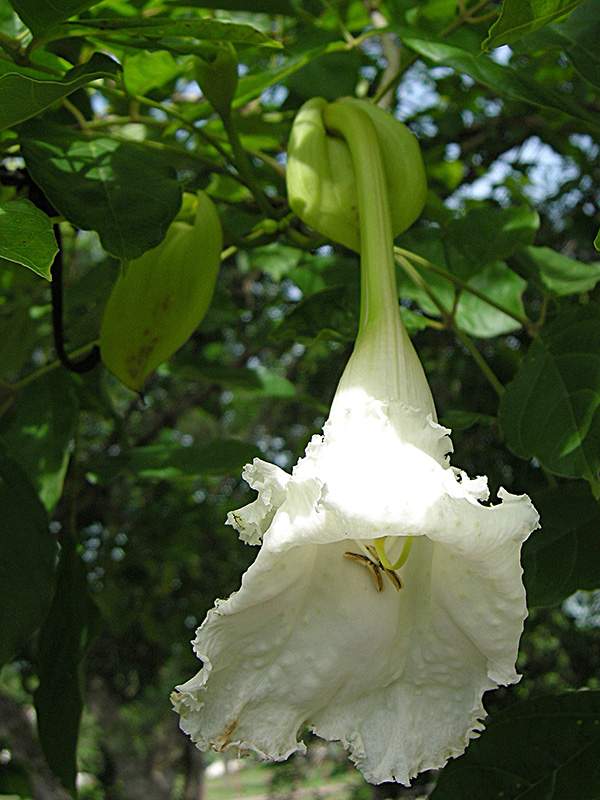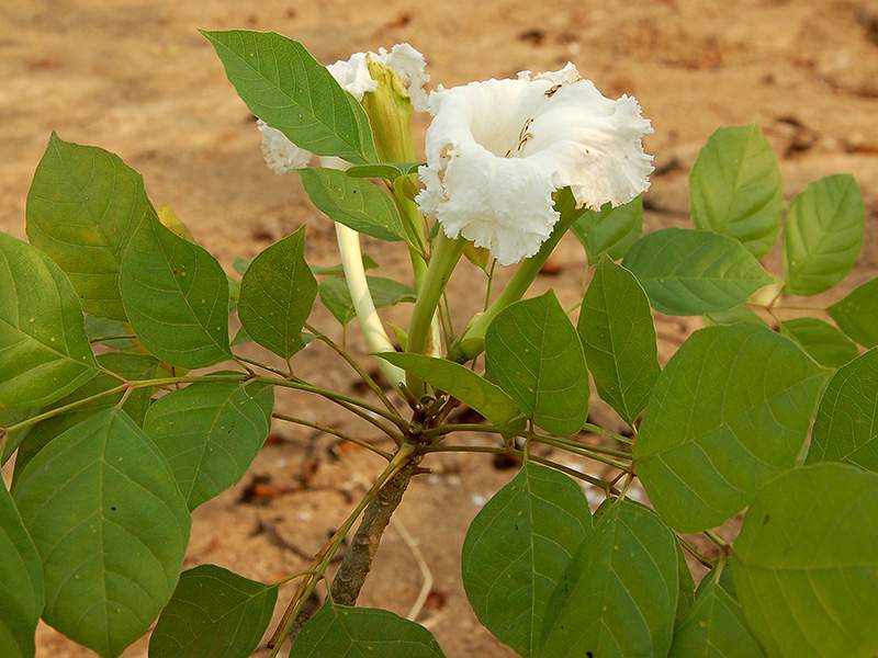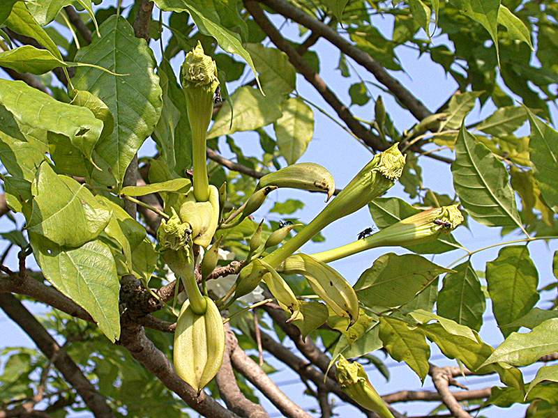 ไม้ต้น ใบประกอบเรียงตรงข้ามสลับตั้งฉาก มีใบย่อย 3–5 คู่ ขอบจักห่าง ๆ โคนเบี้ยว ช่อดอกแบบช่อกระจะ ออกสั้น ๆ ตามปลายกิ่ง ก้านดอกยาวได้ถึง 4 ซม. กลีบเลี้ยงเป็นกาบ ยาว 4–5 ซม. หลอดกลีบดอกยาว 6–10 ซม. โคนเรียวแคบ ปลายบานออกรูประฆัง มี 5 กลีบตื้น ๆ แผ่นกลีบย่น เกสรเพศผู้ 2 คู่ ยาวไม่เท่ากัน มีเกสรเพศผู้ที่เป็นหมันยาว 1 อัน ก้านเกสรเพศเมียยาวได้ถึง 12 ซม. ยอดเกสรเพศเมียแยก 2 แฉก ผลรูปแถบ บิดงอ ยาวได้ถึง 85 ซม. ผนังกั้นรูปกากบาท เมล็ดเป็นคอร์กรูปสี่เหลี่ยม มีปีกบางใส