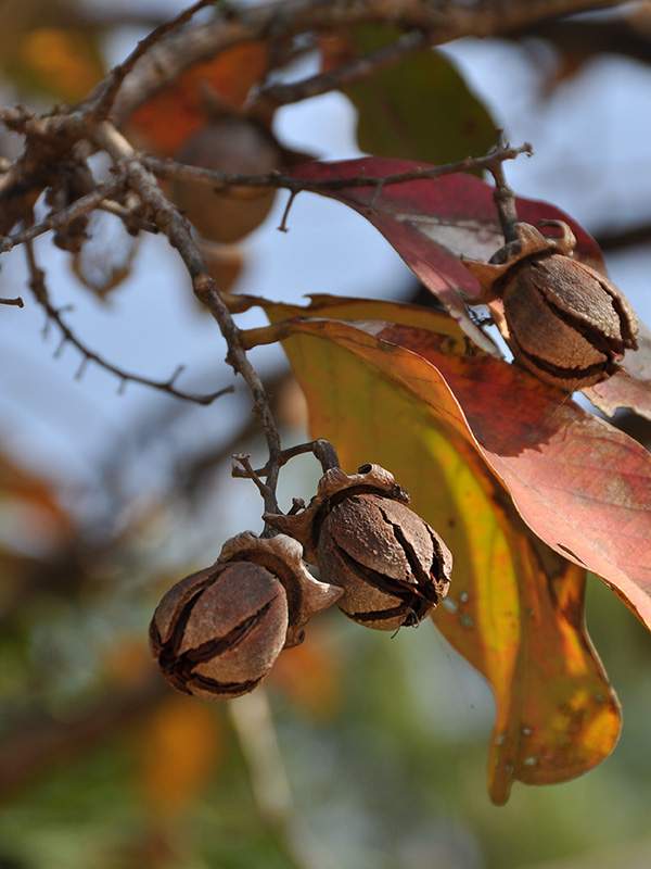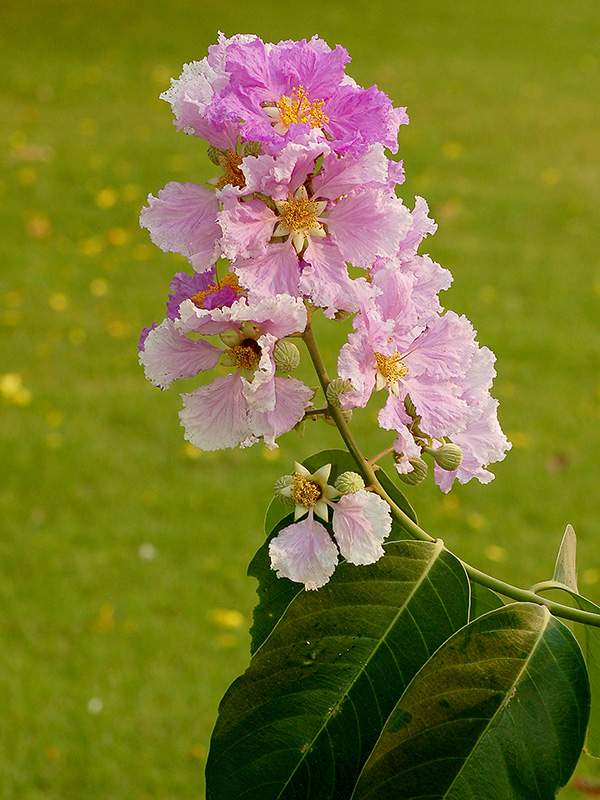 ไม้ต้น ใบเรียงตรงข้าม เกลี้ยงทั้งสองด้าน ช่อดอกยาวได้ถึง 30 ซม. มีขนสั้นนุ่ม ก้านดอกเทียมยาว 0.5–2 ซม. ตาดอกรูปกลมหรือรูปไข่ หลอดกลีบเลี้ยงมีสันตามยาวประมาณ 12 สัน ด้านนอกมีขนละเอียด กลีบหนา บานออกในผล ดอกสีชมพูอมม่วง กลีบรูปกลม ๆ ยาว 3–4 ซม. เกสรเพศผู้ยาวเท่า ๆ กัน รังไข่เกลี้ยง ผลรูปรีกว้างหรือเกือบกลม ยาว 3–4 ซม. เกลี้ยง ปลายมีติ่งแหลม แตกเป็น 6 ซีก เมล็ดจำนวนมาก แบน มีปีกติดที่สันขั้วเมล็ด