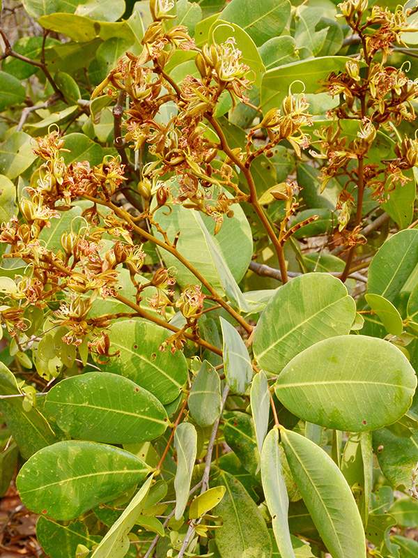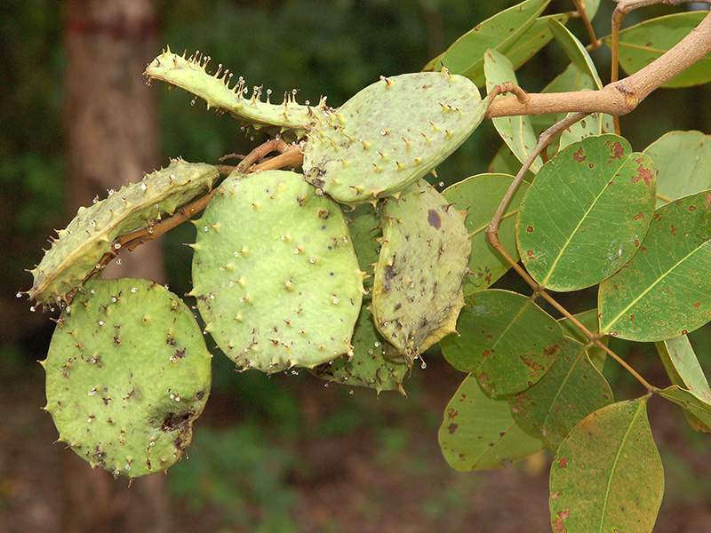 ไม้ต้น มีขนสั้นนุ่มตามกิ่งอ่อน และช่อดอก ใบประกอบมีใบย่อย 3–4 คู่ รูปรี ปลายกลม เว้าตื้น ด้านบนมีขนสาก มีต่อมใกล้ขอบใบด้านล่างด้านหนึ่ง ช่อดอกแยกแขนง ยาว 10–25 ซม. ใบประดับติดทน กลีบเลี้ยง 4 กลีบ รูปเรือ 1 กลีบ รูปใบหอก 3 กลีบ ปลายกลีบมีหนามเล็ก ๆ กลีบดอกมีกลีบเดียว สีเหลืองอมแดง ยาวเท่า ๆ กลีบเลี้ยง เกสรเพศผู้ 10 อัน 9 อันเชื่อมติดกันที่โคนเป็นแผ่น 2 อันด้านบนยาว 1.5–2 ซม. 7 อันขนาดเล็ก รังไข่มีขนและหนามเล็ก ๆ ฝักแห้งแตก แบน รูปไข่กว้าง ปลายมีจะงอย มีหนามกระจาย มี 1–3 เมล็ด ขั้วเมล็ดมีเยื่อหุ้มหนา